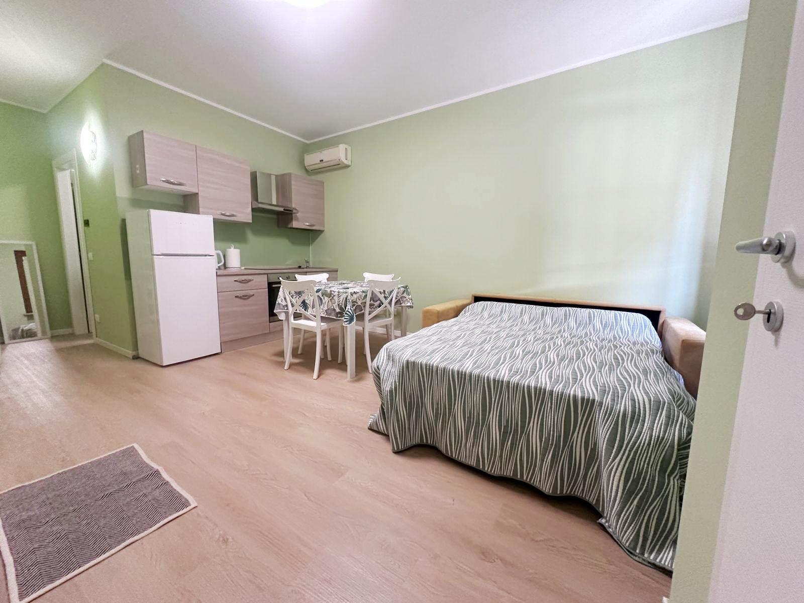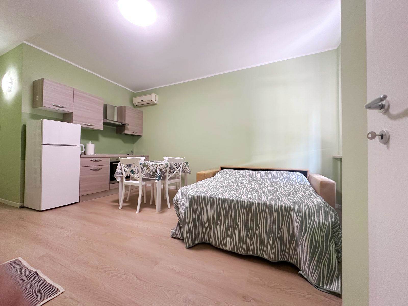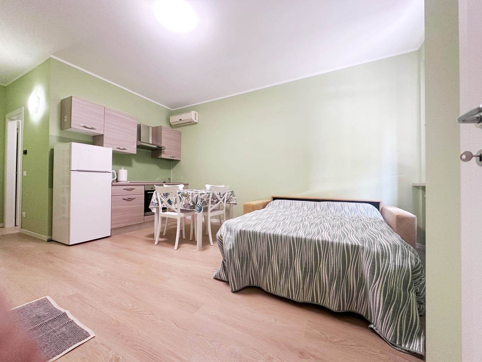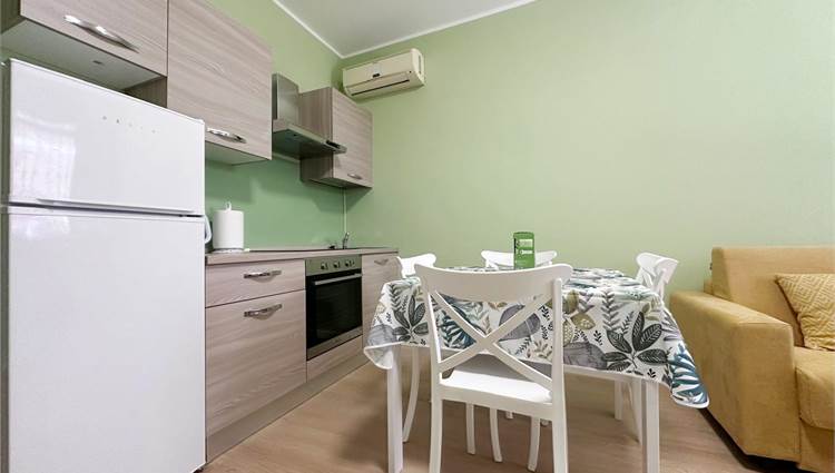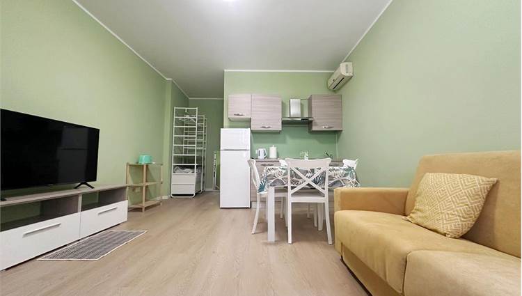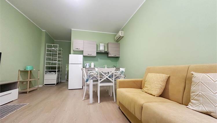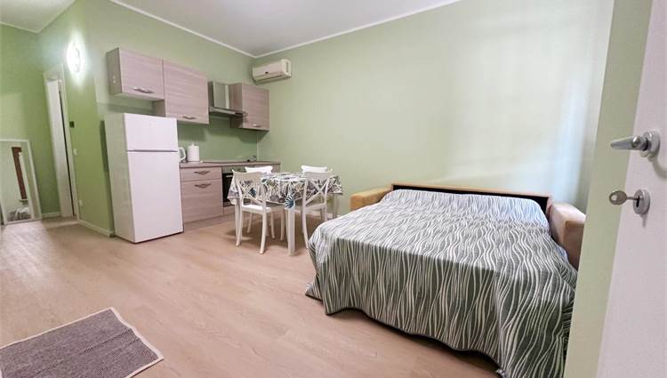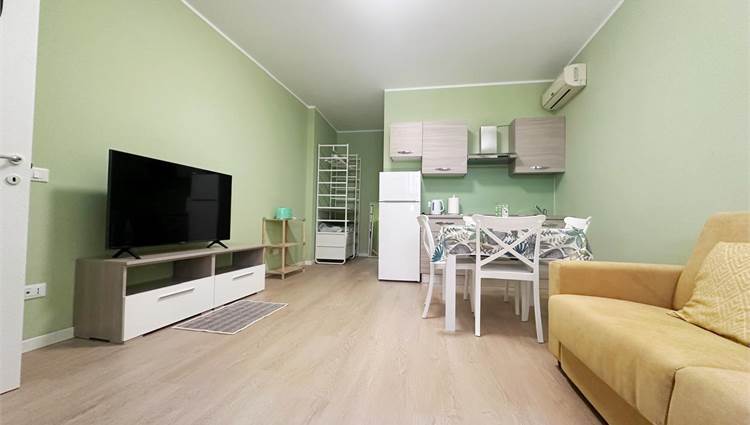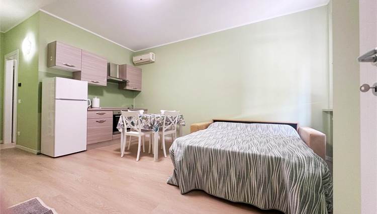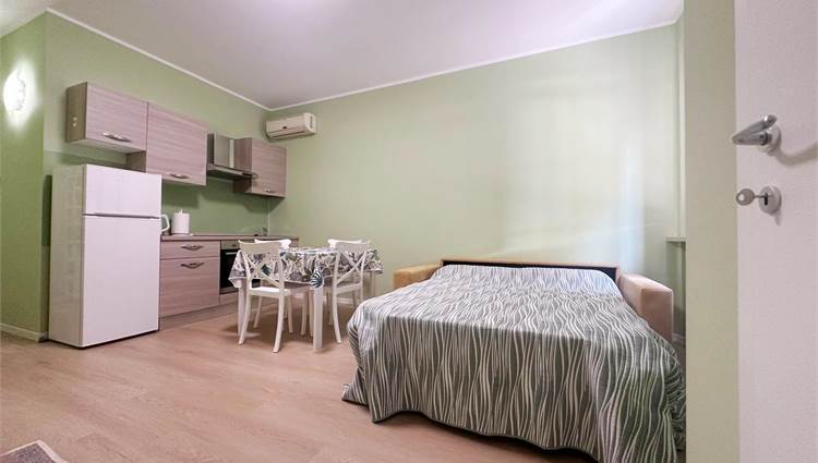 - Lo spazio è composto da una zona giorno con divano letto matrimoniale, cucina a vista completamente attrezzata (fornelli a induzione, tostapane, pentole, bollitore, macchina del caffè) e TV. A disposizione anche aria condizionata e un ampio armadio per il tuo comfort.